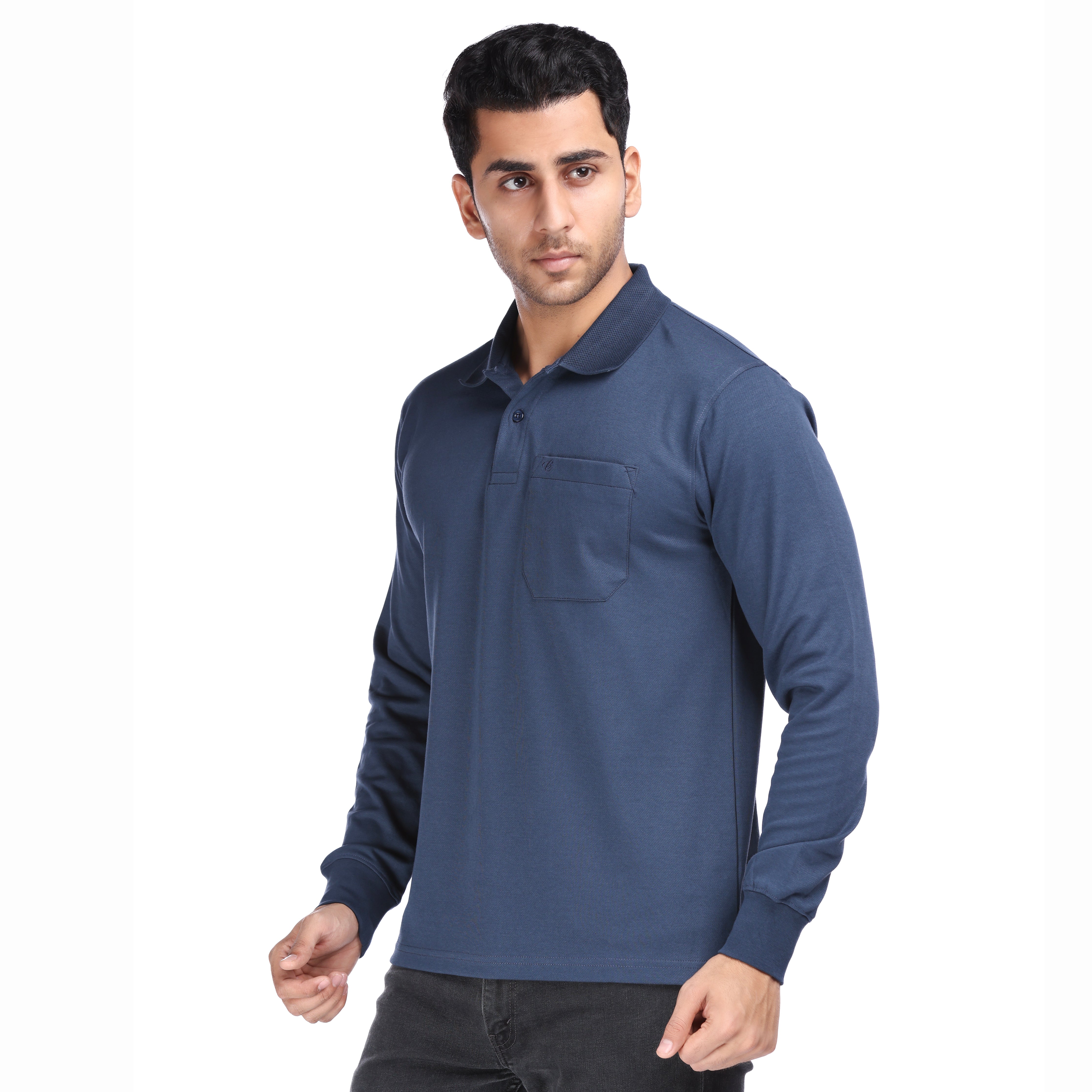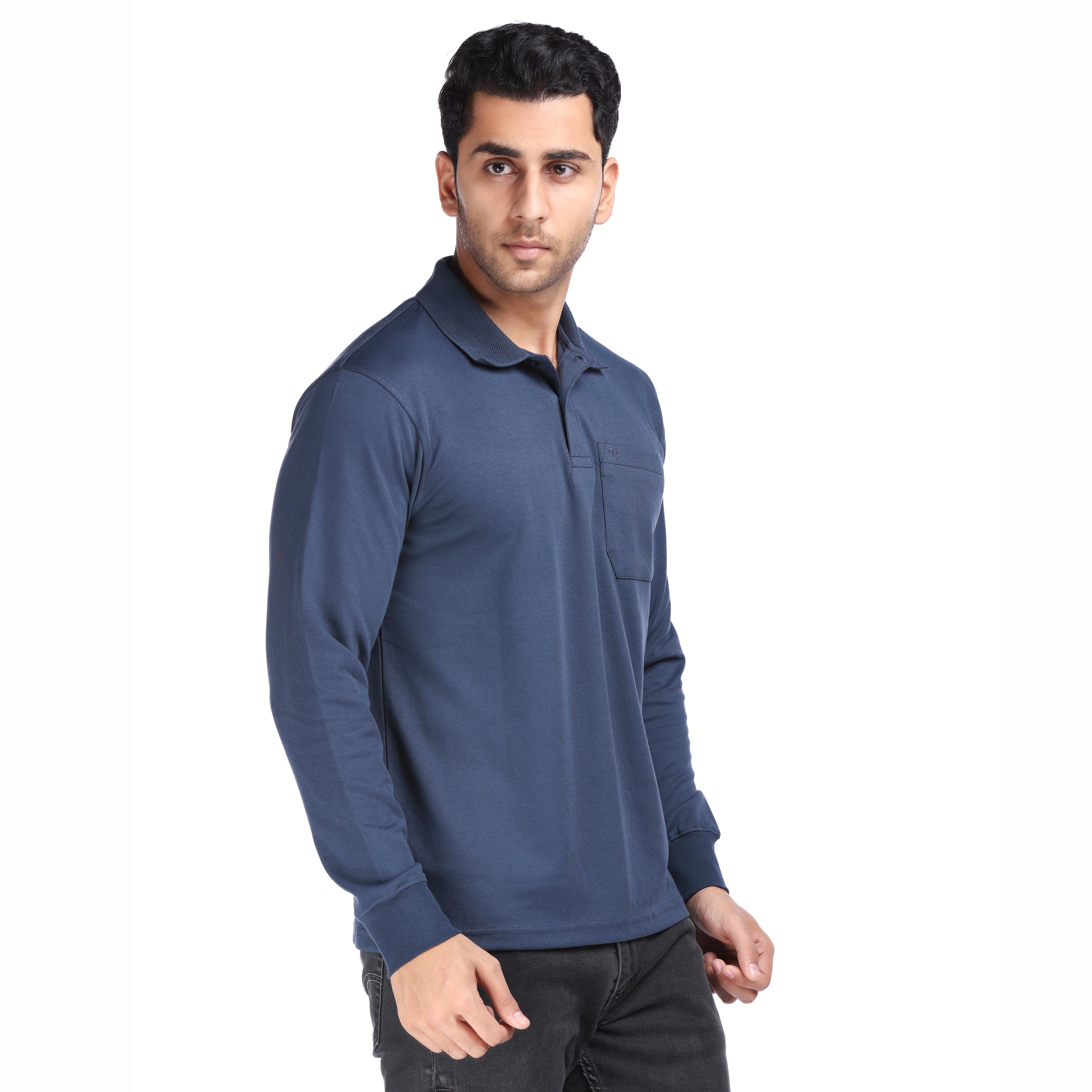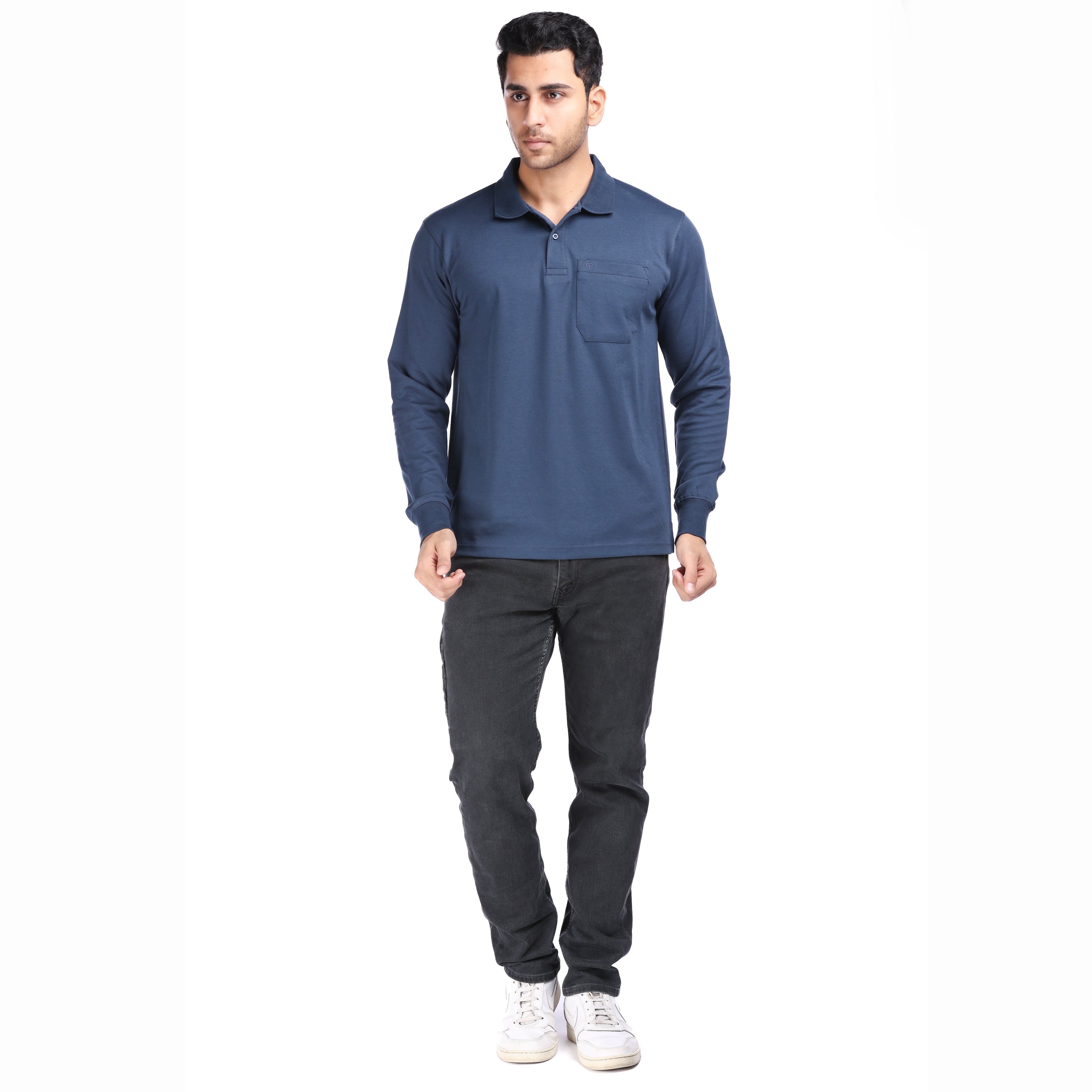 This Full Sleeves Polo in Blue combines superior cotton-dominated fabric with excellent stretch, ensuring comfort and durability for everyday casual wear. Designed with a distinctive collar and a practical chest pocket, it offers both style and functionality. Ideal for men's winter outdoor activities, this high-quality shirt provides warmth without compromising mobility, making it a versatile addition to any wardrobe.