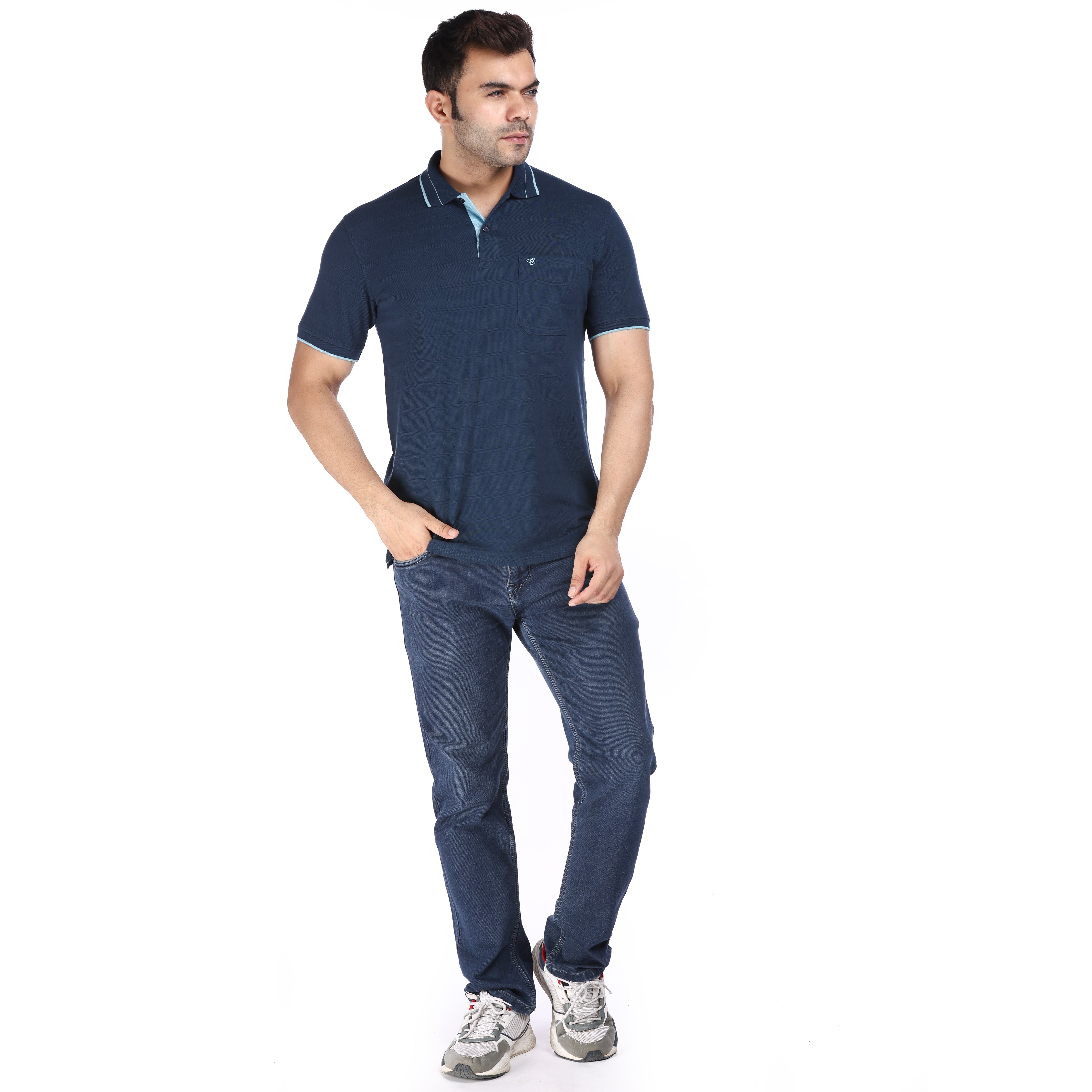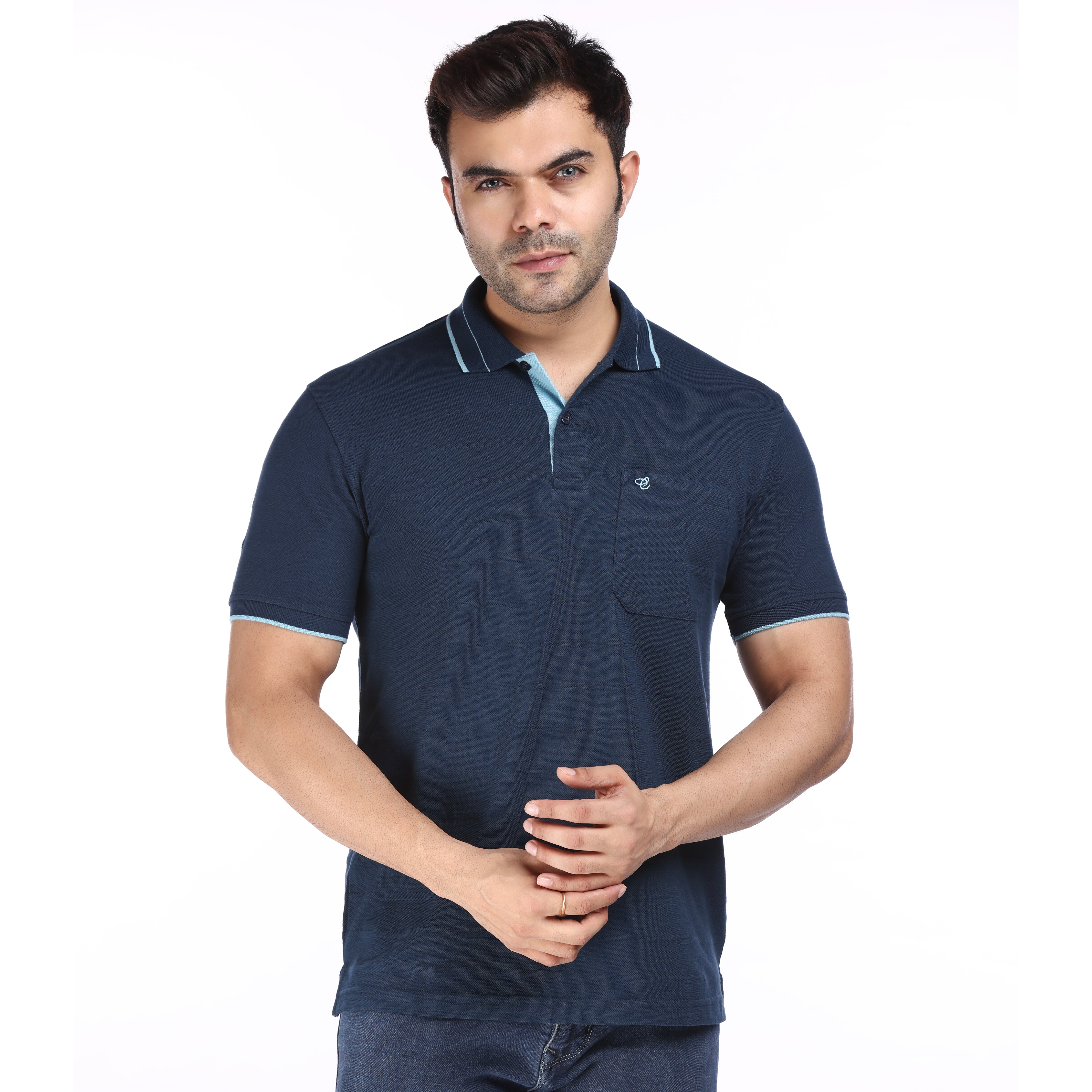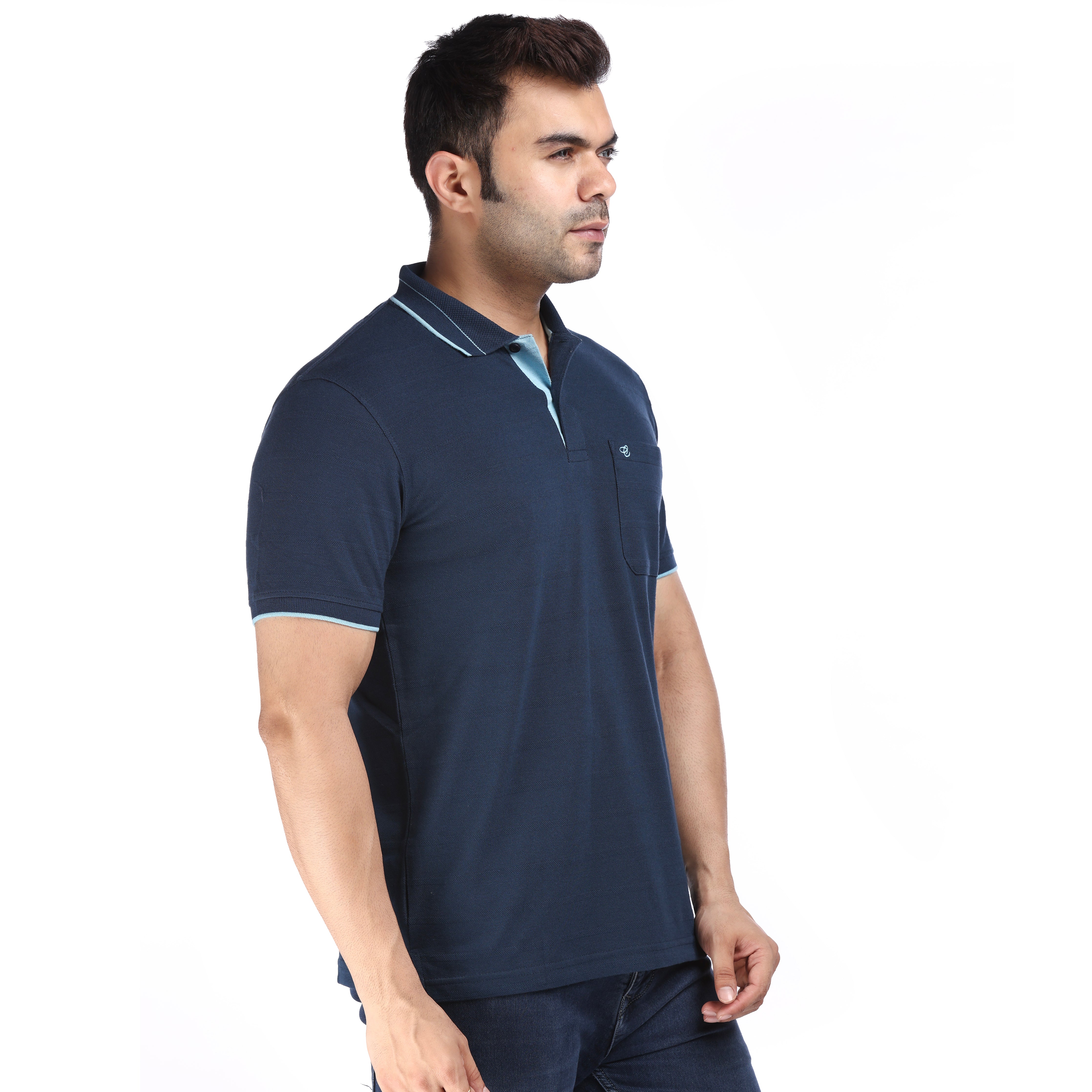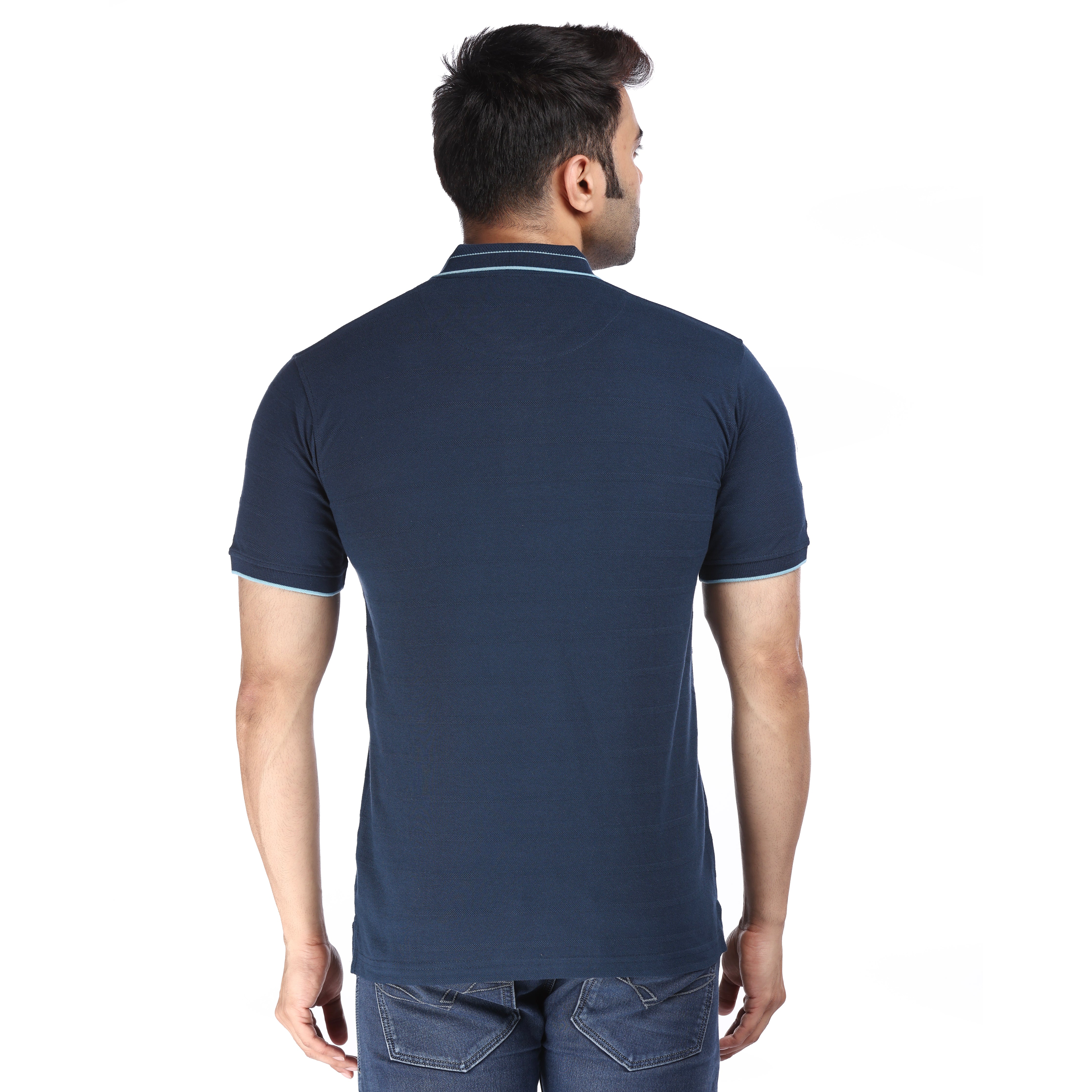 This designer blue polo tee offers a regular fit crafted from a stretchable, cotton-dominated fabric that ensures comfort and durability throughout daily wear. Its structured construction maintains a sharp silhouette, while the short sleeves and practical chest pocket add functional style. Ideal for casual outings and outdoor activities, this polo combines expert-tailored design with versatile comfort.