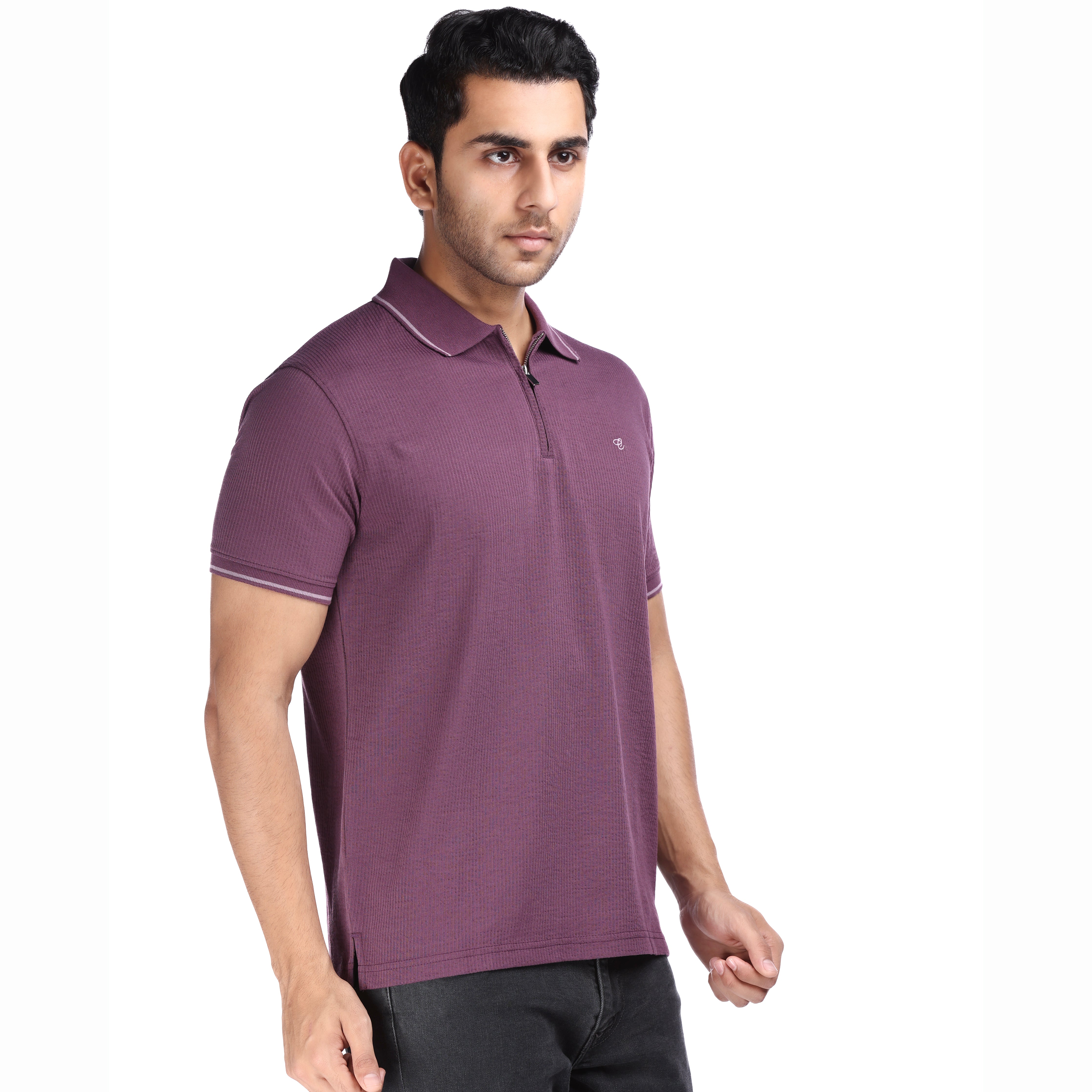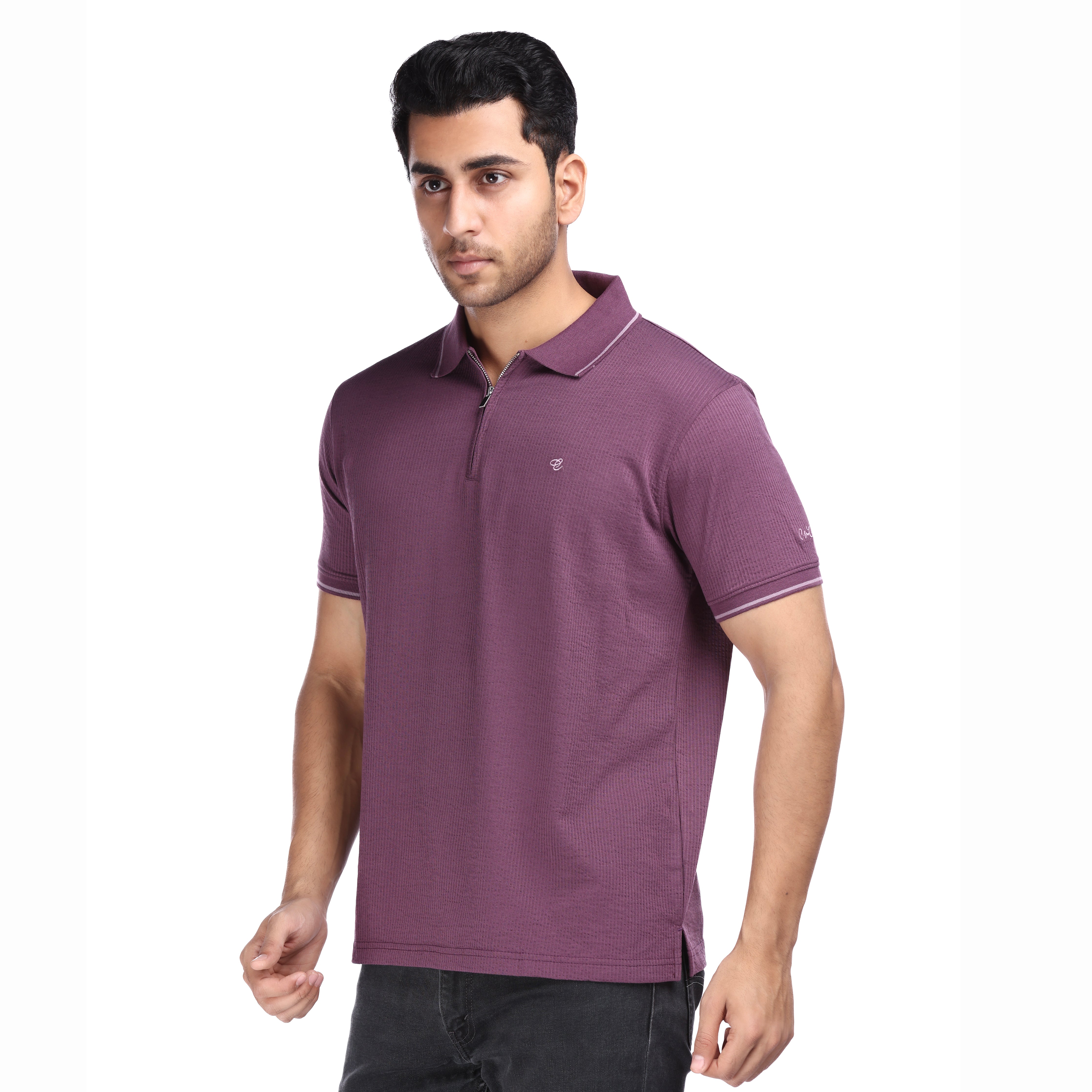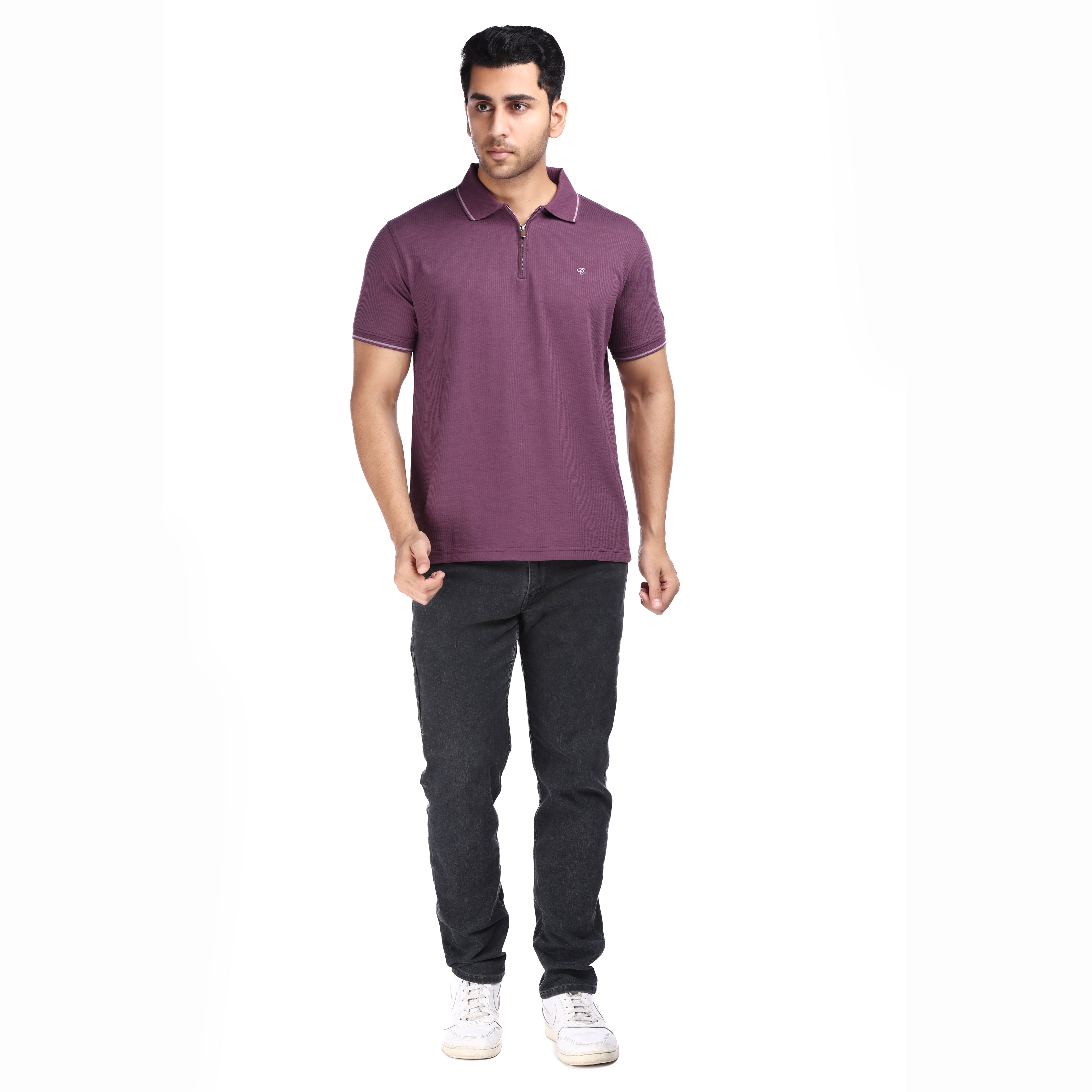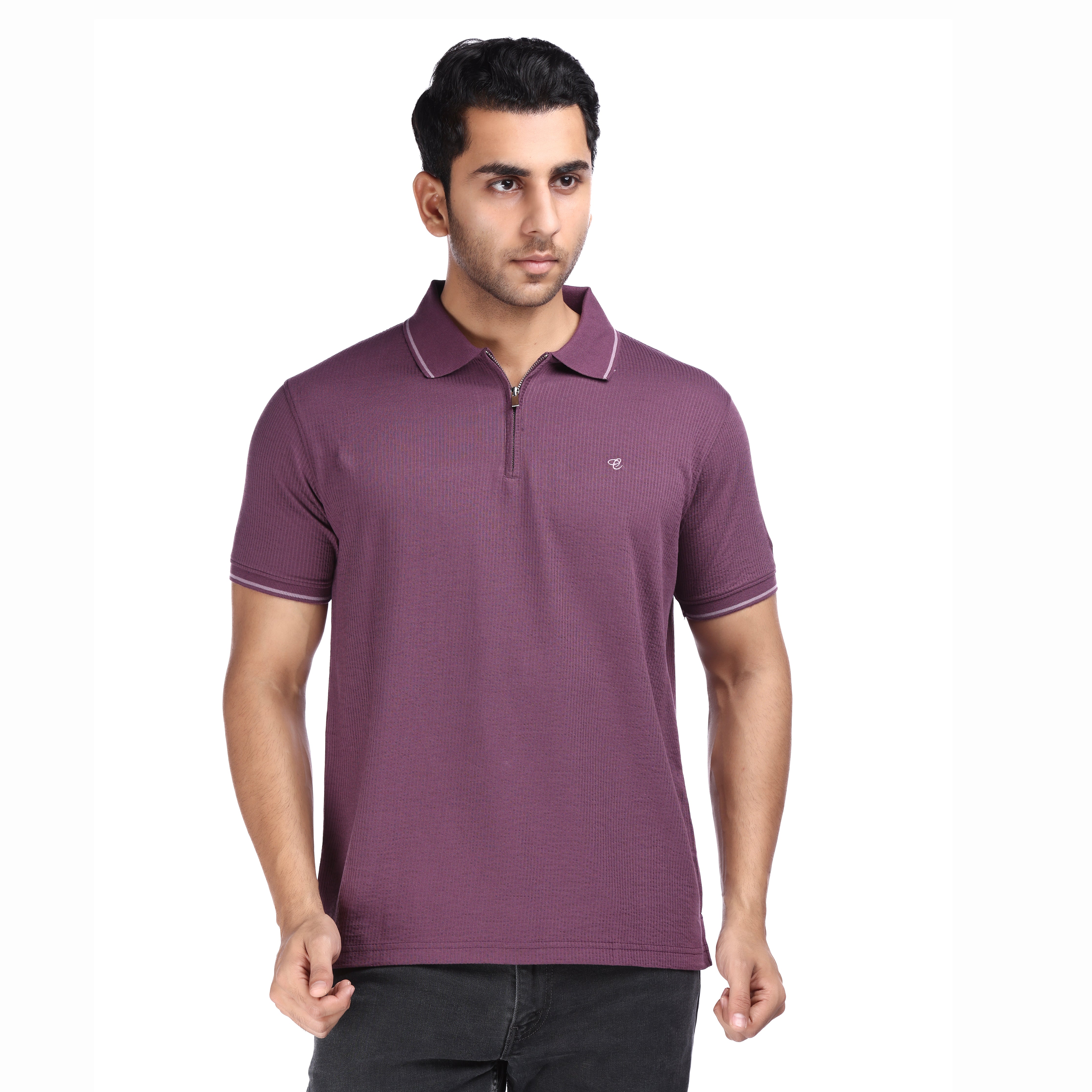 Elevate your everyday wardrobe with this versatile zipped polo that seamlessly transitions from casual to formal settings. Crafted from a cotton-dominated blend with strategic stretch, the structured fabric maintains its shape while offering superior comfort throughout the day. The distinctive dual-tone collar adds a refined design element, while the short sleeves keep you cool and collected. Available in a sophisticated dark pink, this regular-fit piece features a functional zip neck for effortless styling flexibility. Whether paired with jeans or tailored trousers, this polo delivers the polished appearance and all-day wearability that discerning men demand.