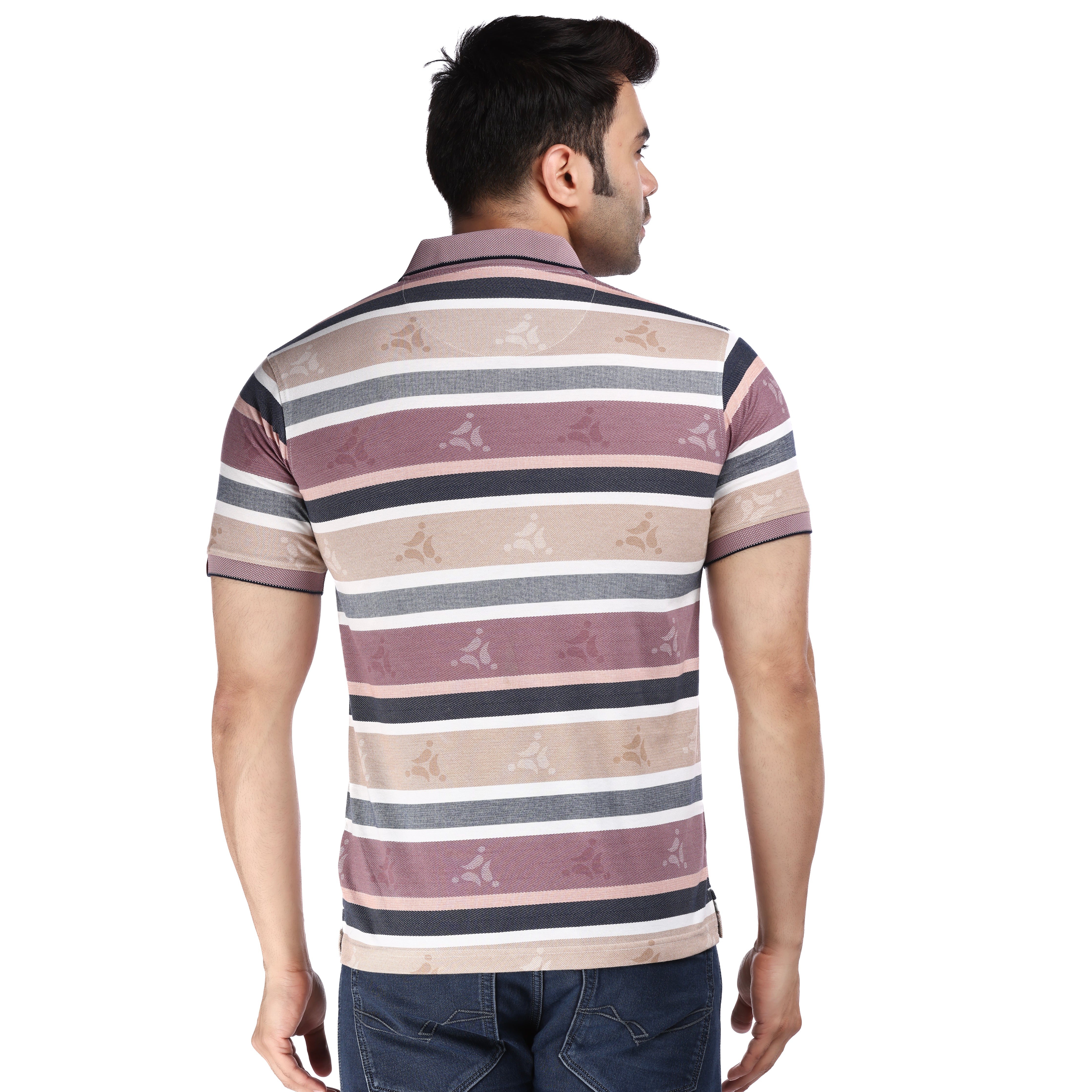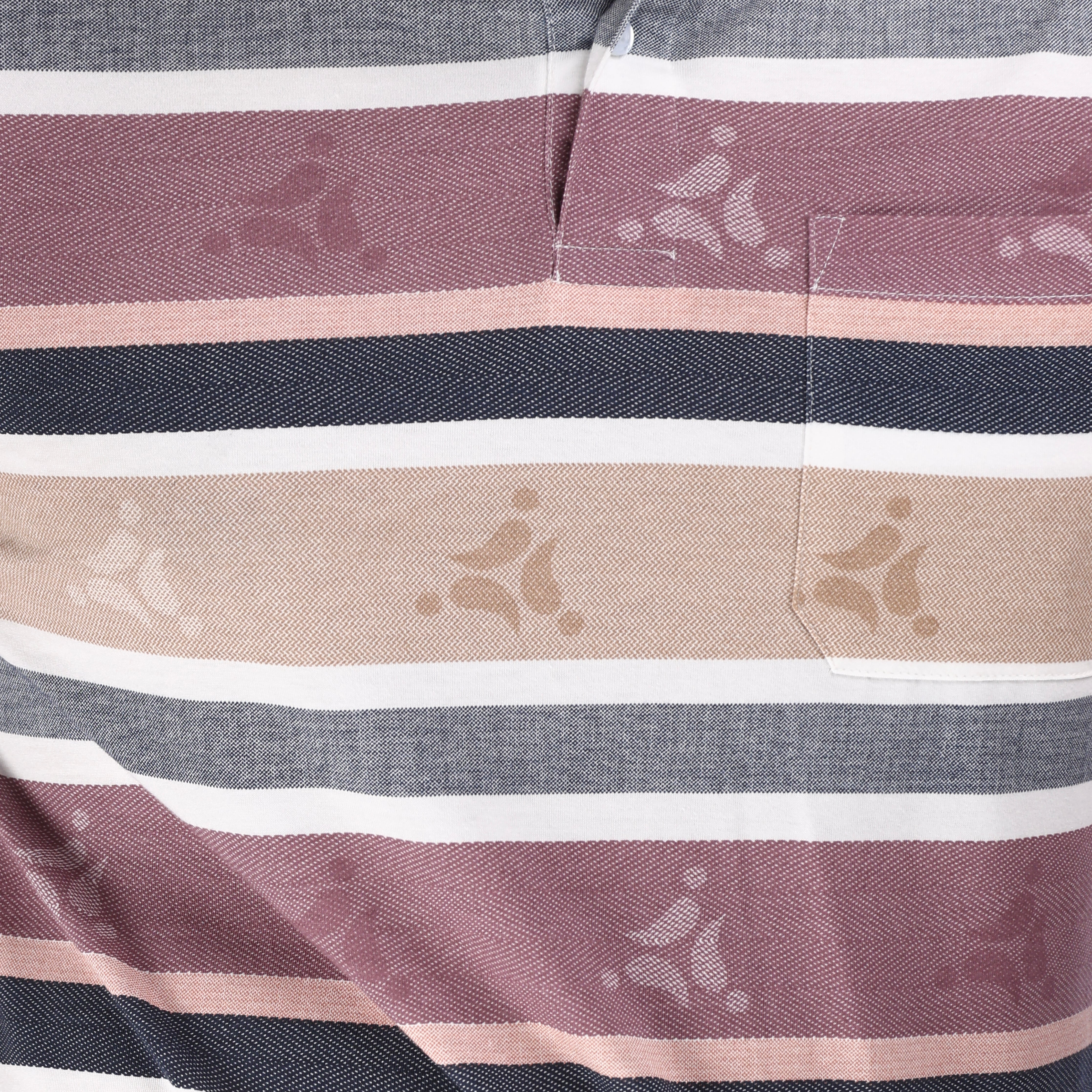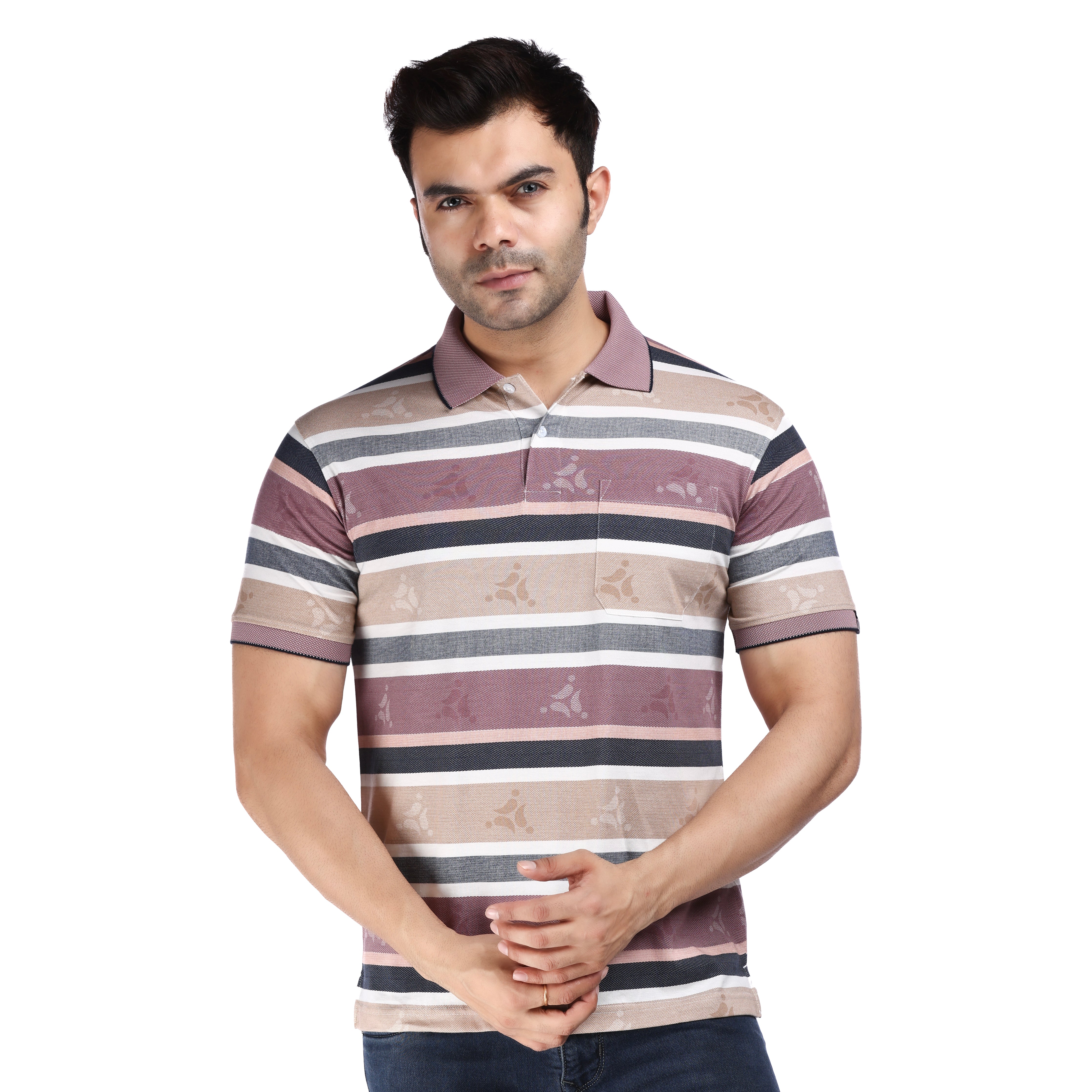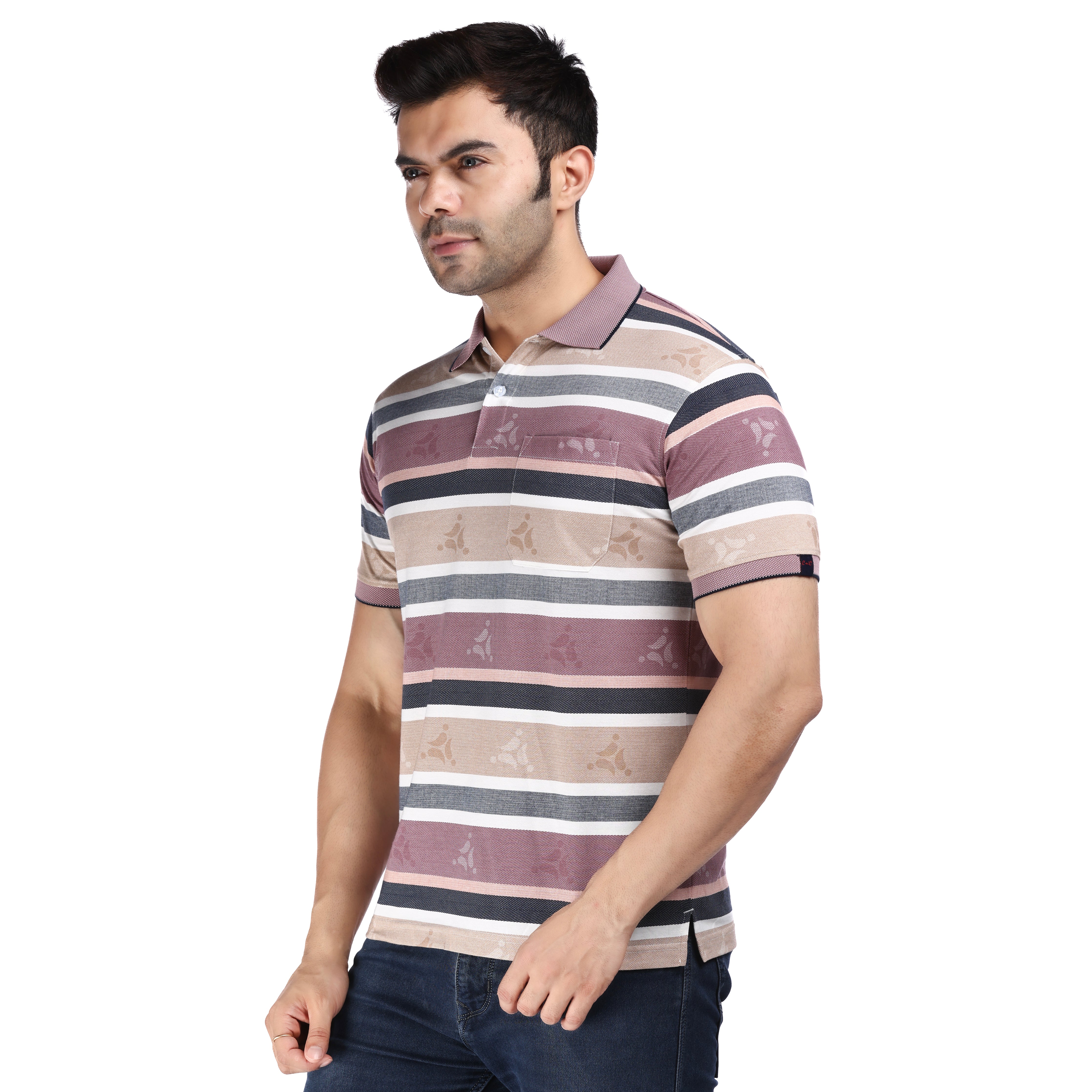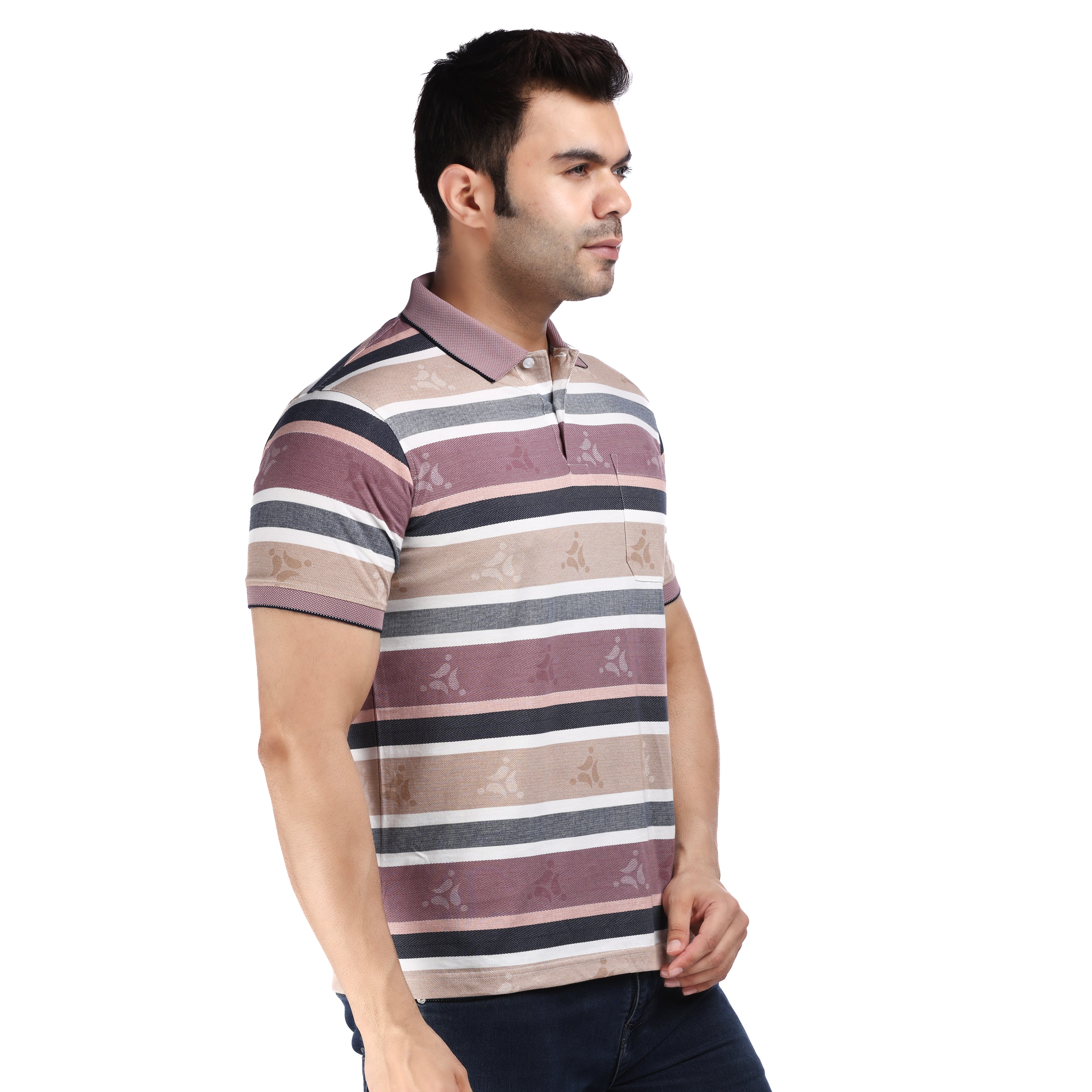 This men's printed polo tee combines classic style with practical comfort. Crafted primarily from cotton with stretchable fabric, it ensures ease of movement for daily wear and outdoor activities. The regular fit and short sleeves offer a relaxed yet polished look, enhanced by subtle pink and beige stripes. A convenient chest pocket adds functionality without compromising style, making this polo an excellent choice for casual, versatile dressing.